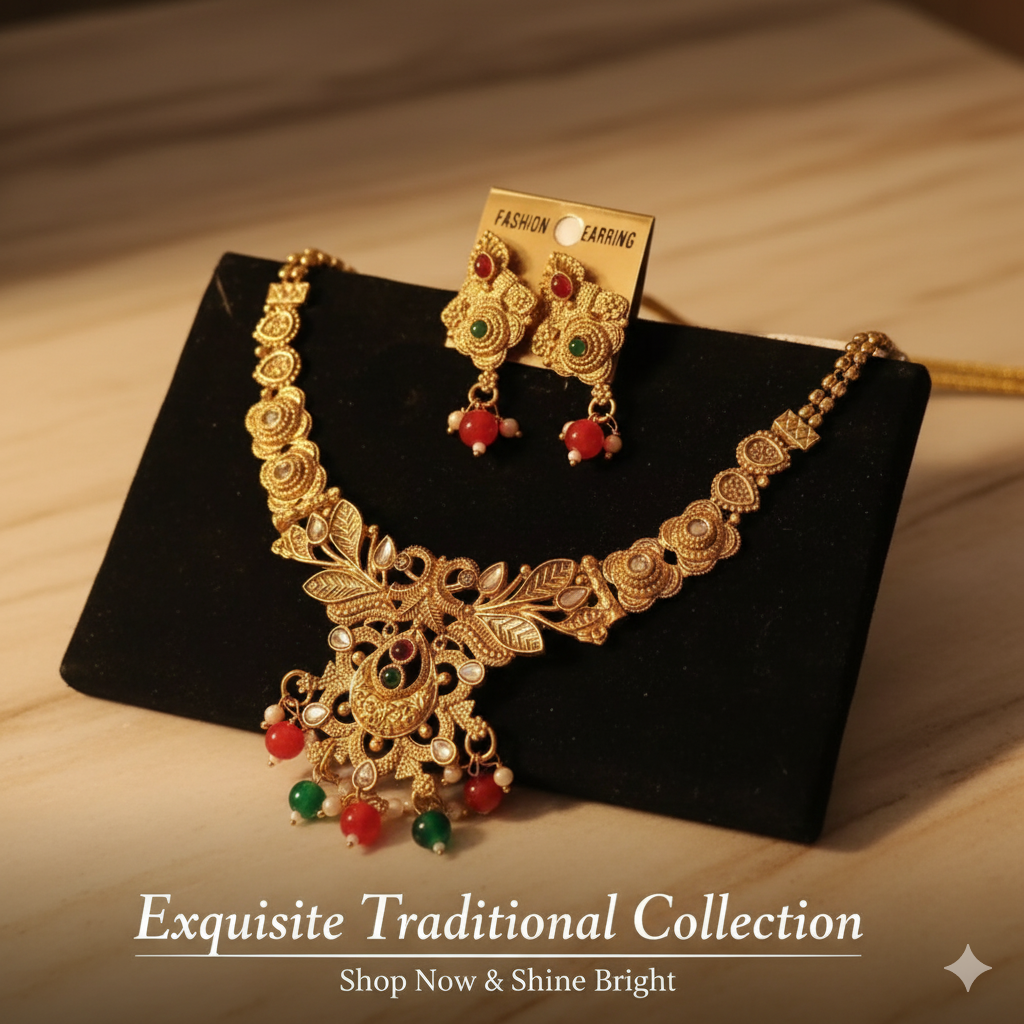 Celebrate every occasion with grace. Featuring intricate gold work and vibrant red and green beads, this necklace and earring set is a true showstopper. Tap to shop and own the moment.